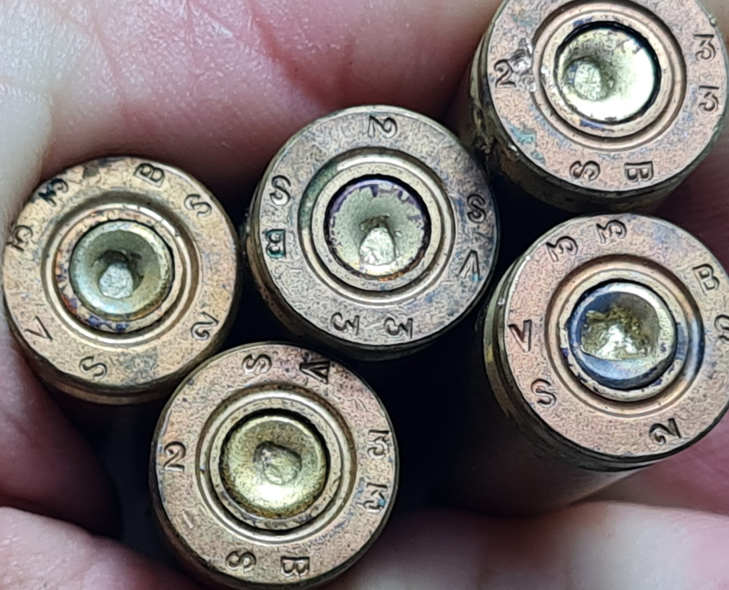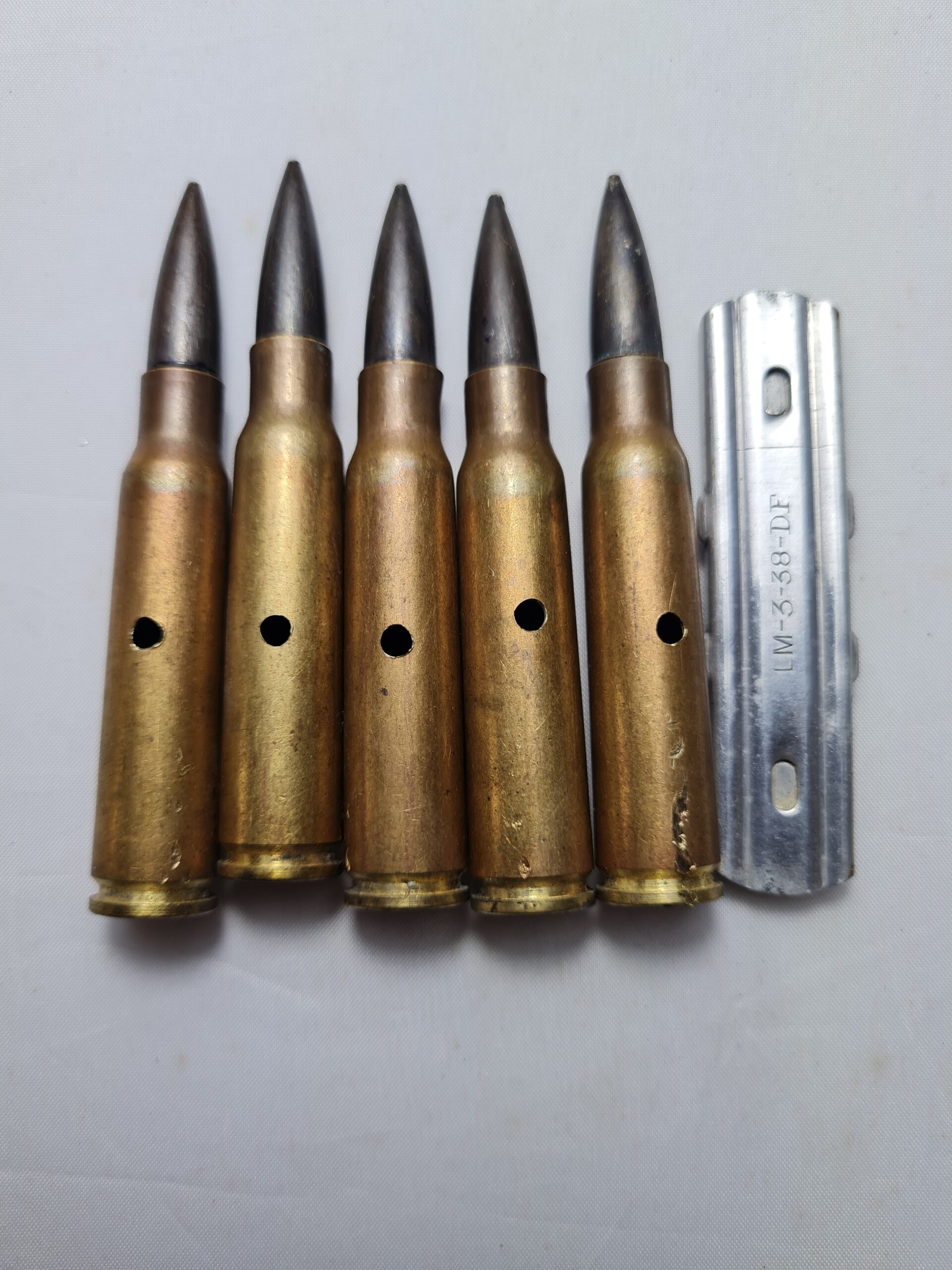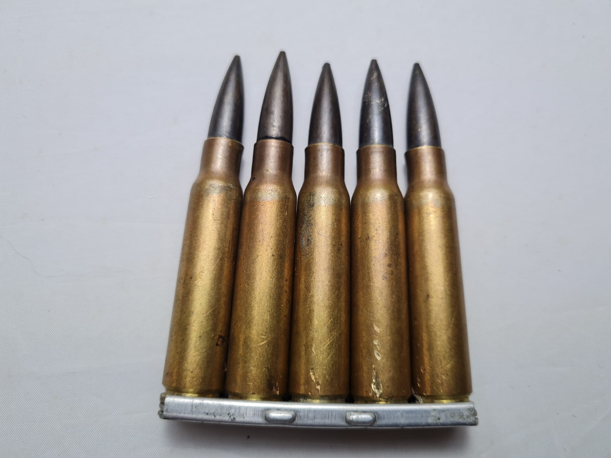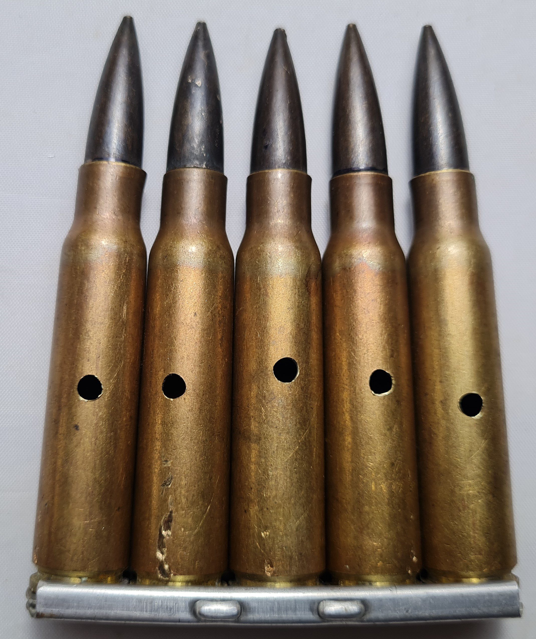 France — Original 2eme guerre — Clip de fusil avec ses 5 cartouches Cal 7,5 – — Neutralisées, percées, percutées — bel état – voir photos
