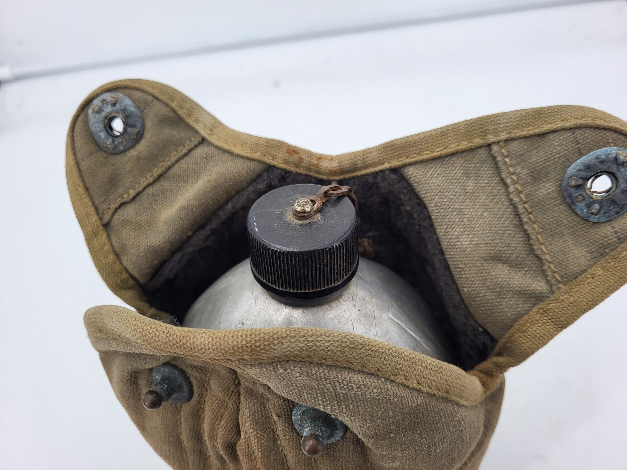 USA –original 2eme guerre — Gourde complète ( housse, gourde, ) -Modèle pour parachutistes, ou cavalerie— –Housse  1942 — — gourde 1942 -matricule gravé — voir photos